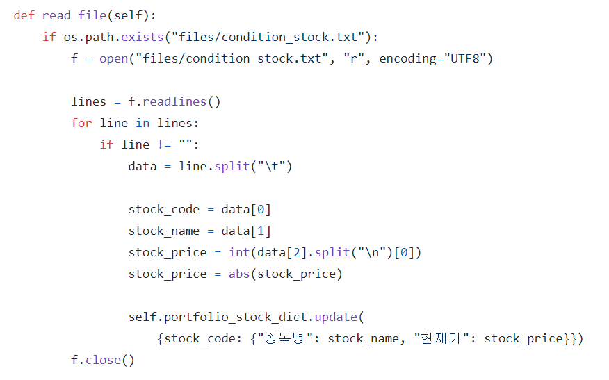 readline() 함수를 이용하여 포트폴리오 파일에 있는 종목을 읽어옵니다. 그리고 이 데이터들을 __init__() 에서 정의한 self.portfolio_stock_dict에 저장하면 됩니다.