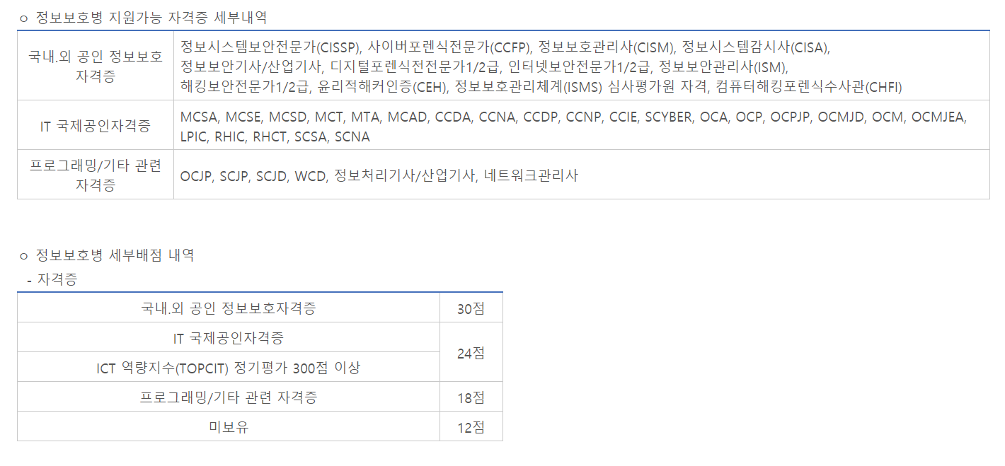 이것이 해군 정보보호병의 지원 자격입니다. 자격증과 관련 학과 전공을 모두 만족할 필요는 없고, 하나만 충족하면 됩니다. 하지만, 해군 정보보호병의 합격률을 높이려면 당연히 관련 학과 전공자이면서 IT 자격증을 취득하는 것이 좋겠죠?