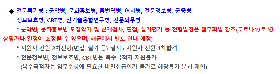 위 사진은 공통 지원 자격입니다. 전문특기병의 기술적인 지원 자격을 만족하더라도, 신체등급같은 각종 기본 조건은 충족해야 해군을 지원할 수 있습니다.