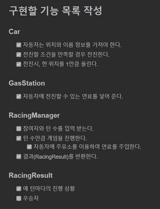 이 중 체크 표시 안 된 우승자와 RacingResult의 테스트 코드를 제외하고는 모두 구현하고 커밋까지 완료하였습니다.