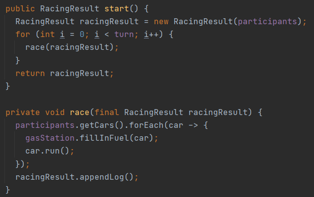 먼저, 게임을 시작하는 start()를 정의해야하였는데, 저는 이 함수 안에서 입력, 턴 동안 자동차 경주, 출력이라는 3가지 일을 하려고 하였으나, 이것은 메소드가 하나의 일만 하는 것이 아니라고 나봄이 알려주었습니다. 그래서 대처 방안을 물어보니, 입력은 메인에서 하여 클래스의 멤버 변수로 넘겨주고, 메소드 내에서는 경주 게임을 진행하고, 반환을 RacingResult 객체로 하여, 이 객체를 통해 출력하는 것이었습니다. 저는 프리코스에서도 이 부분을 어떻게 해결할 수 있을지 고민하였는데, 단번에 해결이 되어서 참 속이 시원한 순간이었습니다.