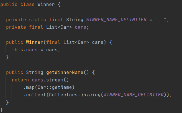 먼저, 스트림을 사용하여 최대 위치를 구하고, 자동차 중 가장 먼 거리에 간 자동차가 여러 대일 수 있으므로 컬렉션으로 모았습니다. 그리고 이것도 Winner라는 일급 컬렉션에 따로 보관하였습니다.