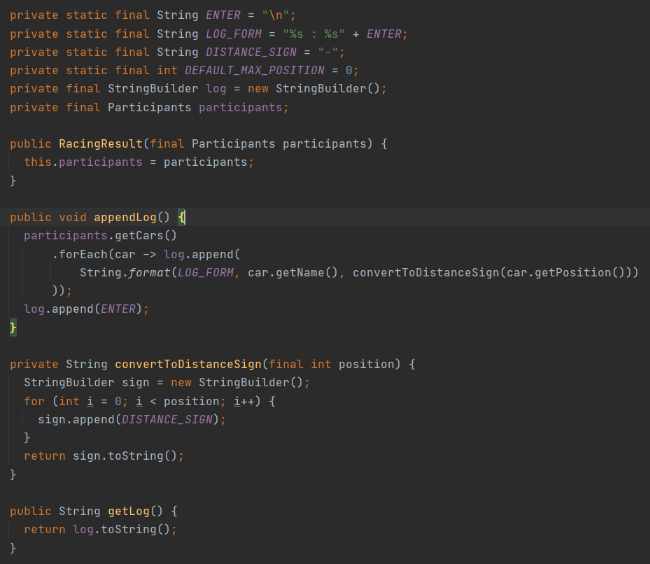 이 객체는 출력할 내용을 담을 것인데, 경주의 진행 상황과 우승자를 담습니다. 여기서 진행 상황을 담는 방법에 대해서 서로 고민을 많이 하였습니다. 처음에는 key를 턴, value를 또 다시 map으로 하여 key를 자동차의 이름, value를 위치로 하려고 하였습니다. 하지만, 코드 작성 중 생각보다 복잡해져서 이를 폐기하고 StringBuilder 클래스를 이용하여 "%s : %s" 형태로 문자열을 쭉 담기로 변경하였습니다.