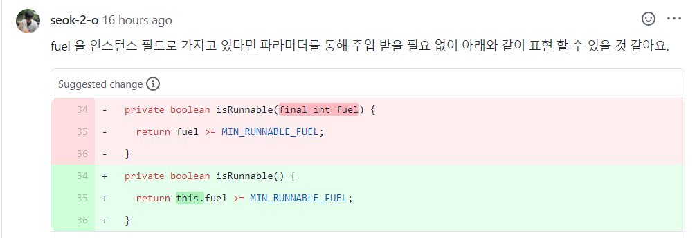여덟 번째 수정 사항은 파라미터 삭제입니다. fuel을 생각해 보니, 이미 인스턴스 필드로 갖고 있었는데도 의미 없이 fuel을 또 파라미터로 주입받았네요. 바로 지웠습니다.