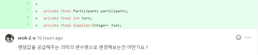 일곱 번째 수정 사항은 변수명 변경입니다. 자동차 경주 게임에서 연료는 랜덤값으로 충전되므로 단순히 변수명을 fuel으로 하기보다는 randomFuel이 낫다고 판단됩니다.
