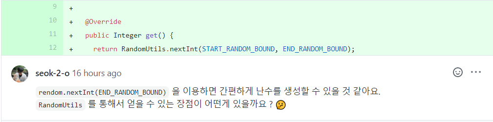 다섯 번째 수정 사항은 내장 클래스 사용입니다. 이 부분은 제가 프리코스때 주어진 RandomUtils를 반드시 써야한다고 생각하여 이 클래스의 nextInt() 메소드를 사용한 것인데, 다시 생각해 보니 굳이 의미가 없었습니다. 그래서 대신 Random 클래스를 사용하여 난수를 만들어냈습니다. 이것도 피드백 내고 생각해 보니 RandUtils 패키지를 아예 삭제해야겠습니다 ㅋㅋㅋ