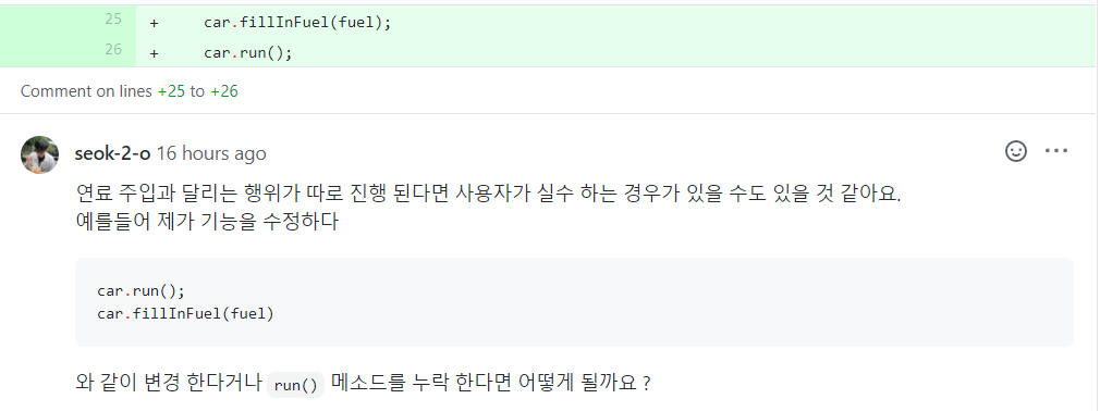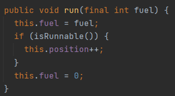 그래서 인자로 충전할 연료를 받고, 연료를 충전하고 그 양에 따라 달리는 것으로 수정하였습니다. 이미 피드백 내고 나서 생각하는건데 메소드 이름을 fillInFulAndRun() 으로 바꾸는 편이 더 좋은 것 같기도 합니다. 이것은 2차 피드백 이후에 고민해 보겠습니다.