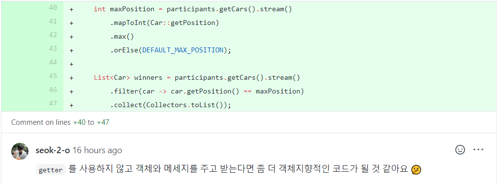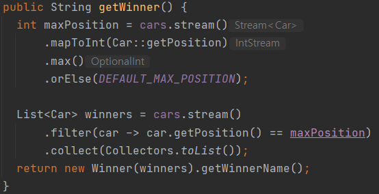 Participants 클래스는 멤버 변수로 List<Car>를 갖고 있기때문에 바로 이 리스트를 이용하여 우승자를 가려낼 수 있습니다. 다만, maxPosition을 구할 때 orElse() 메소드로 초기값을 정해주어야하는데, 이를 상수로 하게 되면 멤버 변수에 상수를 추가해야합니다. 그런데 Participants 클래스가 DEFAULT_MAX_POSITION 상수를 갖는 것이 바람직하지 않는 것 같아서, 굳이 상수 처리를 안 하고 0으로 써도 되는지 궁금하여 이 부분은 리뷰어 님께 질문하였습니다.