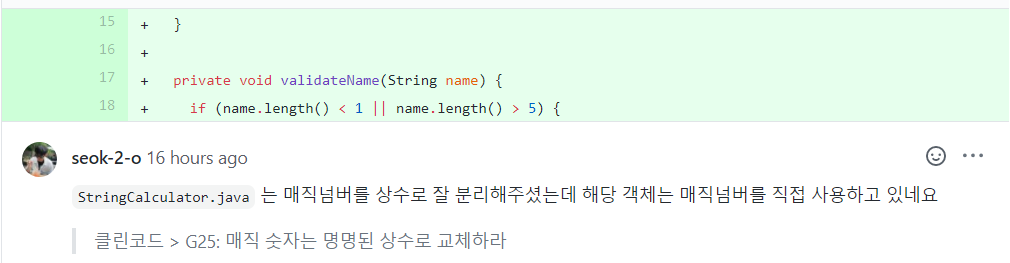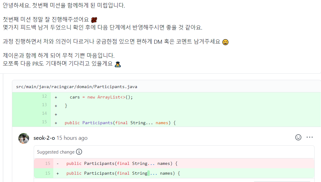 이런 방식으로 제가 코드 리뷰를 요청하면, 리뷰어 분이 피드백을 남겨주시는 방식으로 온라인 코드 리뷰가 진행됩니다. 귀한 시간 내 주신 것에 다시 한 번 감사드립니다!!