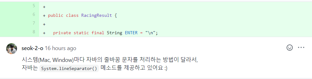 여섯 번째 수정 사항은 줄바꿈 문자입니다. OS에 따라 이 줄바꿈 문자가 다르기때문에 '\n'으로 처리하지 말고 System.lineSeparator()를 사용하라는 것이죠. 이것은 완전 새롭게 알게된 것이라 흥미로웠고, 다음부터는 주의해야겠습니다.