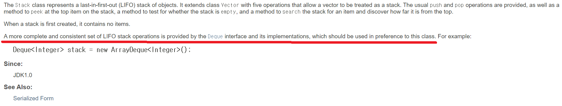 그리고 놀랍게도 오라클 문서에도 Stack을 사용할 때는 Deque를 사용하여 구현하라고 나와있습니다. Deque는 정말 간단히 말하면 Stack과 Queue의 짬뽕인데, Stack을 사용하기 위해서 Deque를 이용하라는 것은 아이러니합니다.