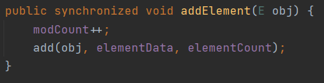 직접 인텔리제이에서 Vector 소스를 까 보면, 아래와 같이 addElement()가 synchronized를 사용하여 동기화가 되어있습니다.