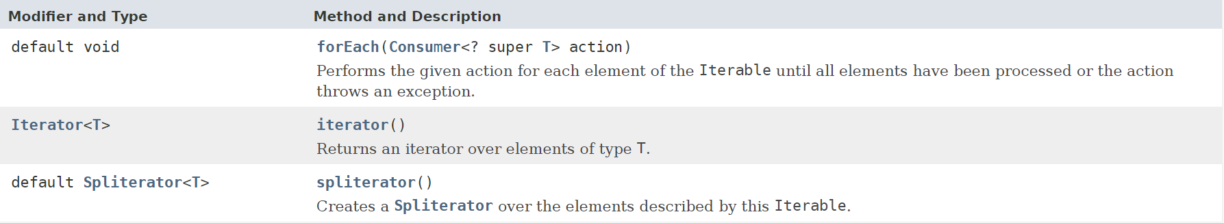 default 메소드인 forEach(), spliterator()가 있고 상속받은 클래스에서 구체화해주어야 하는 Iterator() 메소드가 있습니다. 여기서 forEach()와 iterator()는 모두 잘 아실 겁니다. 다만, spliterator()는 파이프라이닝 관련 메소드라 이 포스팅에서 설명하지는 않겠습니다.