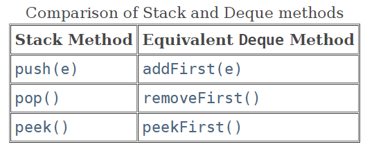 Deque는 Stack의 메소드도 모두 가지고 있습니다. 위 사진은 Stack 메소드와 Deque에서 새롭게 정의한 메소드를 비교하고 있습니다. Stack의 push(e)와 Deque의 addFirst(e)는 같다고 말하고 있는 것이죠.