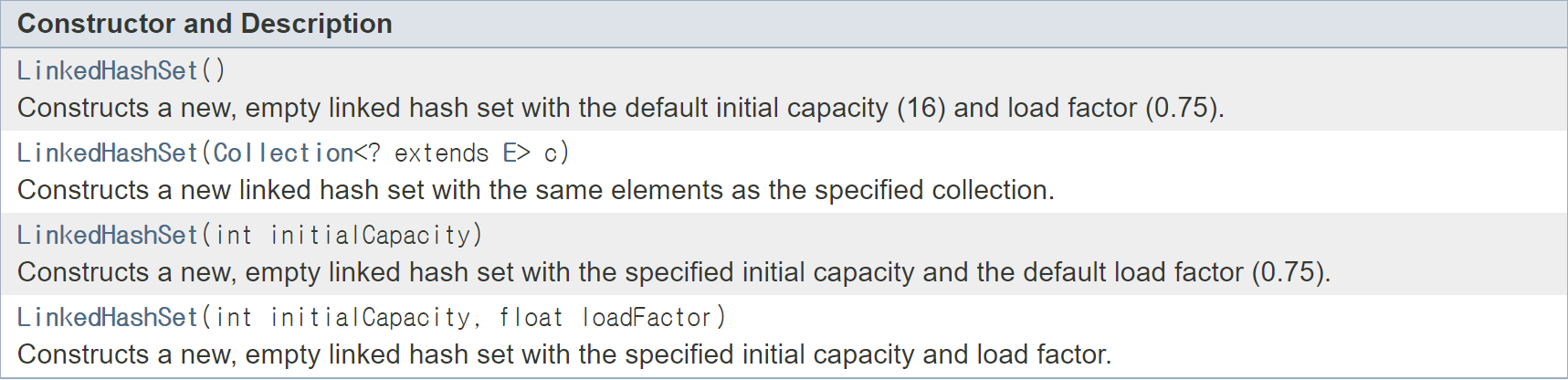 위 사진은 LinkedHashSet의 생성자를 나타낸 것인데, HashSet과는 달리 내부적으로 LinkedHashMap 인스턴스를 이용하여 요소를 저장한다고 나와있습니다. 요소를 삽입하는 순서대로 순서를 유지하는 마술은 LinkedHashMap을 알아야 이해할 수 있을 것입니다.