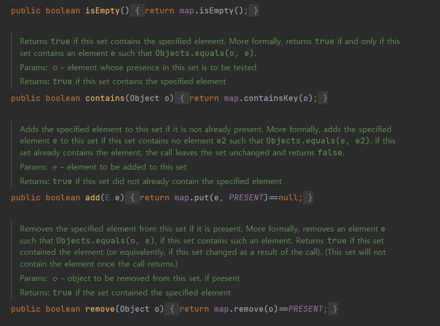 그리고 이 map의 내장 메소드와 PRESENT를 사용하여 HashSet의 다양한 메소드를 정의합니다. PRESENT는 더미 데이터로 map에 value를 넣어 주기 위하여 어쩔 수 없이 이용하는 것이라고 보면 되겠습니다. 즉, HashSet은 Map의 Key만 사용하고 Value는 버리는 방식으로 구현되어있습니다.