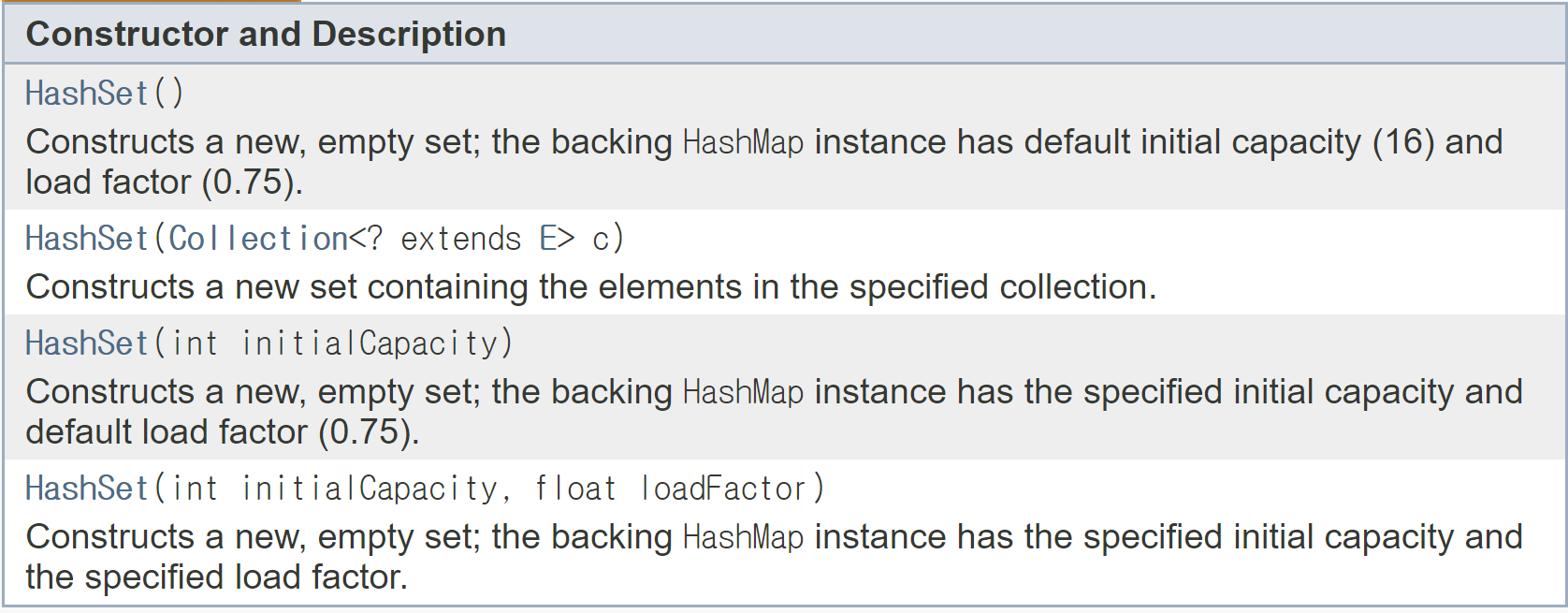 위 사진은 HashSet의 생성자입니다. 설명을 잘 읽어보면, 내부적으로 해시맵 인스턴스를 이용하여 요소를 저장한다고 합니다. 그리고 초기 용량은 16이고, load factor는 0.75라고 되어있습니다. 물론, 이 용량과 load factor는 개발자가 자유롭게 설정이 가능합니다.