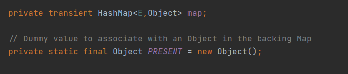 이것은 HashMap의 필드인데, HashMap과 PRESENT를 사용하는 것을 알 수 있습니다.