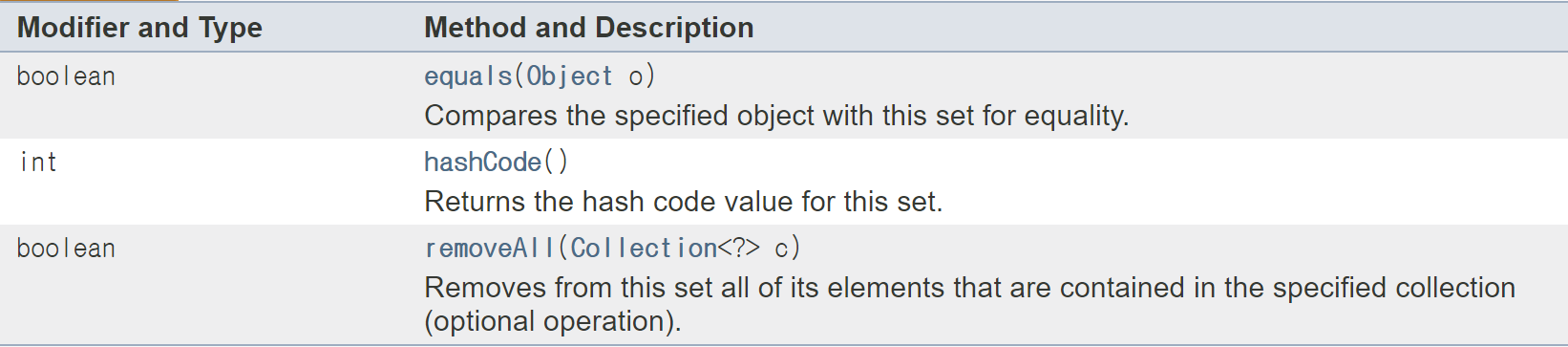 그리고 Set 구현 클래스들은 대부분 이 추상 클래스의 상속을 받으므로 각 클래스마다 따로 equals(), hashCode(), removeAll()을 구현해 줄 필요가 없습니다.