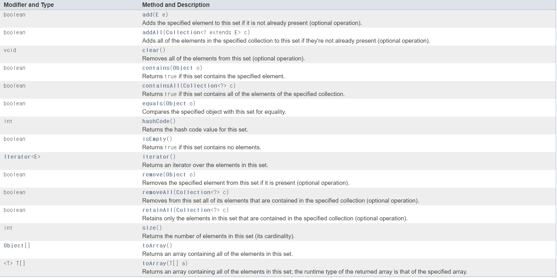 아래는 equals()와 hashCode() 외의 다른 Set 내장 메소드입니다.
