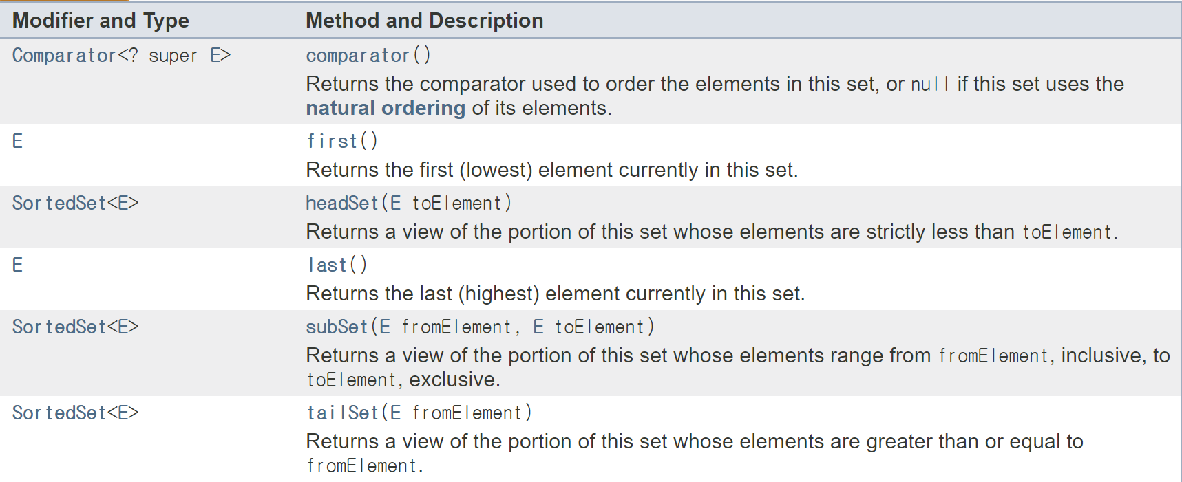 위 사진은 SortedSet의 메소드인데, comparator()을 통해 요소를 정렬해 주는 것을 알 수 있습니다. 또는 Comparable의 상속을 받아서 compareTo()를 재정의하고 있는 객체를 요소로 사용해야합니다. 나머지 메소드는 Set의 일부분을 반환하는 것이라서 쉽게 이해하실 수 있을 것입니다.