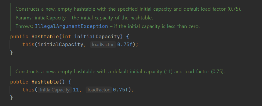 그리고 실제로, Hashtable의 생성자를 보면, 용량과 load factor를 설정할 수 있습니다. 인자로 두 개 다 넘기는 것은 생략하였습니다. 여기서, 용량은 '버킷의 개수'와 같으며 load factor는 '저장된 데이터 / 용량'과 같습니다.