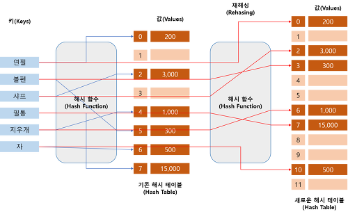리사이징은 버킷의 개수를 늘려주는 작업으로, 새로운 배열에 기존의 Key를 새롭게 재해싱합니다. 그리고 보통 버킷의 개수를 기존의 개수에 2배 정도 늘립니다.