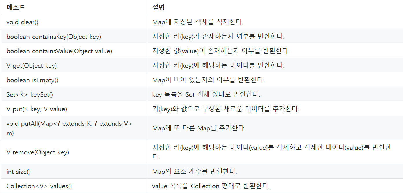 Key와 Value를 쌍으로 저장하는 자료구조로, Key는 중복될 수 없고 Value는 중복이 가능하다는 특징이 있습니다. Key를 통해 Value에 바로 접근이 가능하므로 상수 시간만에 탐색이 가능하다는 장점이 있습니다. 하지만, 데이터의 순서를 보장하지는 않습니다. 주로 사용하는 메소드는 아래를 참고하시면 됩니다.