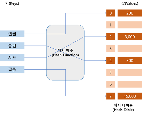 해시 테이블은 Key를 특정 해시 함수를 통해 해싱한 후 나온 결과를 배열의 인덱스로 사용하여 Value를 찾는 방식으로 동작합니다. 여기서, 해시 함수는 Key를 Value가 저장되는 주소 값으로 바꾸기 위한 수식을 의미합니다. 이번 포스팅은 해싱과 관련된 포스팅은 아니므로 해시 함수는 제 임의로 정의하겠습니다.