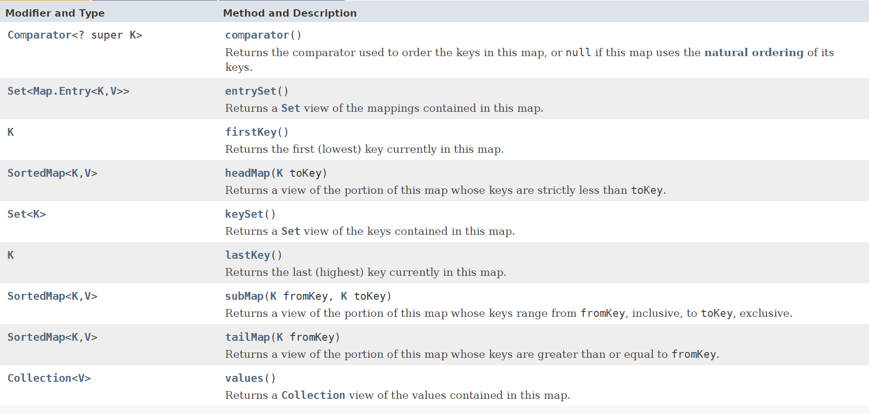 SortedSet 인터페이스와 거의 같습니다. SortedMap 인터페이스도 특정 기준으로 요소를 정렬할 수 있도록 해 줍니다.