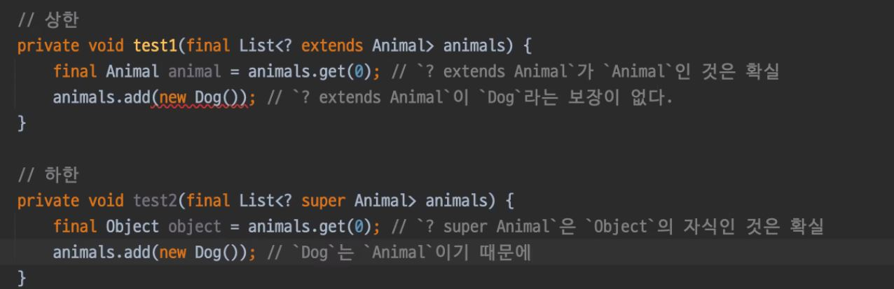 반면에 test2는 제네릭의 하한 경계를 나타내는 것인데, 인자가 Animal의 부모 클래스만 들어올 수 있습니다. 모든 클래스의 최상위 클래스는 Object이므로 위와 같이 animals의 get()으로 요소를 반환할 수 있습니다. 그리고 Dog는 Animal이므로 animals에 Dog 객체를 추가하는 것이 가능합니다.