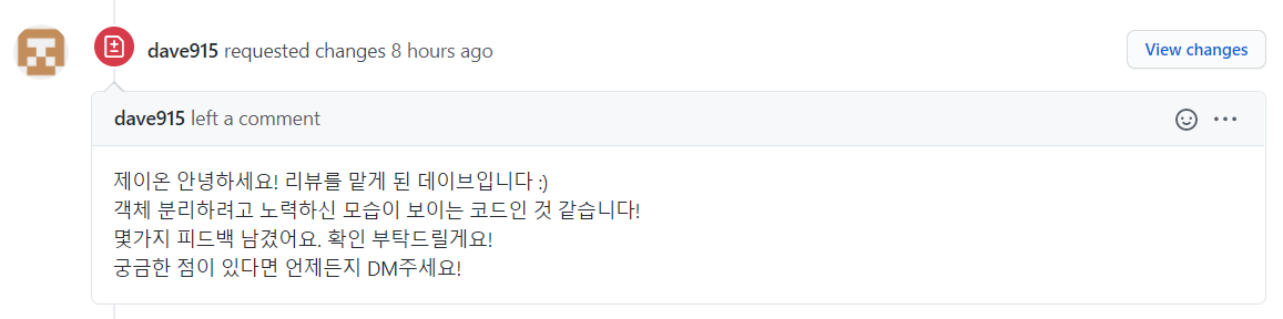 이번 리뷰어 님은 '데이브'였습니다. 주말까지 이렇게 열심히 코드리뷰를 해 주셔서 정말 감사합니다.
