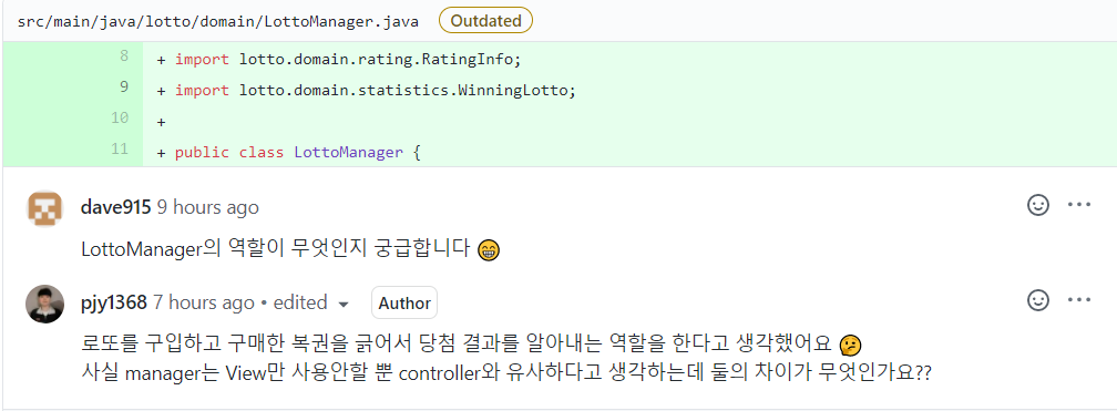 LottoController는 View만 추가로 사용하는 것이지, LottoManager의 역할과 겹친다는 기분이 듭니다. 이 부분도 더 나은 방향으로 설계하기위해서 데이브와 소통하려고 합니다.