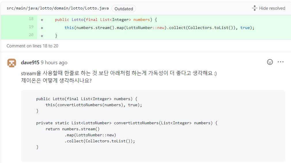 오늘은 기다리던 로또 미션의 1차 피드백을 받아 보았습니다. 그 외에 독서도 하기는 하였지만 메인은 역시 코드 리뷰 내용이겠죠? 제가 피드백 반영한 부분을 위주로 말씀드리겠습니다.