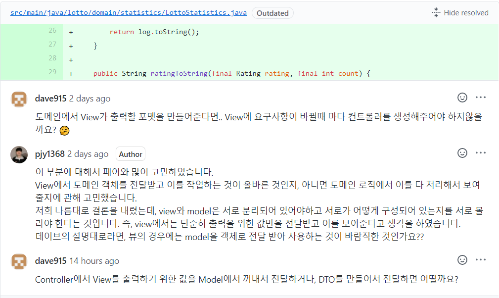 두 번째 피드백은 도메인에 있는 출력 로직을 뷰 로직으로 옮기는 것입니다. 이때, Controller에서 View를 출력하기 위한 값을 Model에서 꺼내서 전달하거나, DTO를 만들어 보라고 조언해 주셨습니다. 저는 우선, DTO를 어제 처음 알아서 개념정도만 간략하게 아는 정도였고 Controller에서 View를 출력하기 위한 값을 Model에서 꺼내서 전달한다는 점이 확 와닿지는 않았습니다..