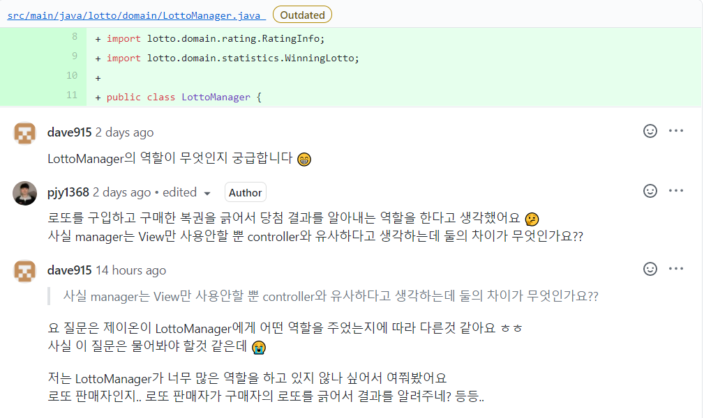 저번 포스팅에서 저는 3가지 피드백에 대해 질문을 하였습니다. 첫 번째는 getInt()에 대한 메소드명을 수정할 것, 두 번째는 도메인에서 출력 로직을 작성하지 말 것, 세 번째는 LottoManager가 하는 일이 많으니 줄일 것이었습니다.