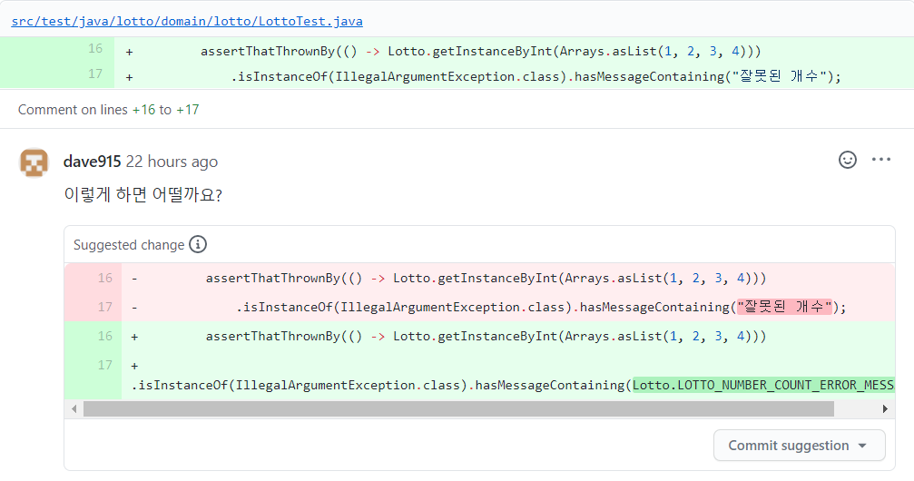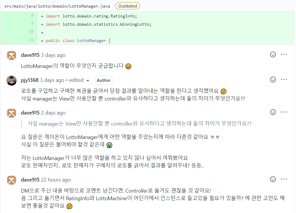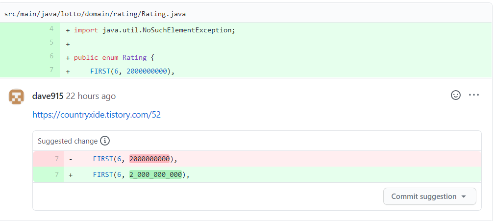 이번 3차 피드백을 마지막으로 로또 1단계 미션은 merge가 되었습니다. 2단계로 넘어가기 전에 데이브가 남겨준 피드백을 몇 가지 살펴보고 가겠습니다.