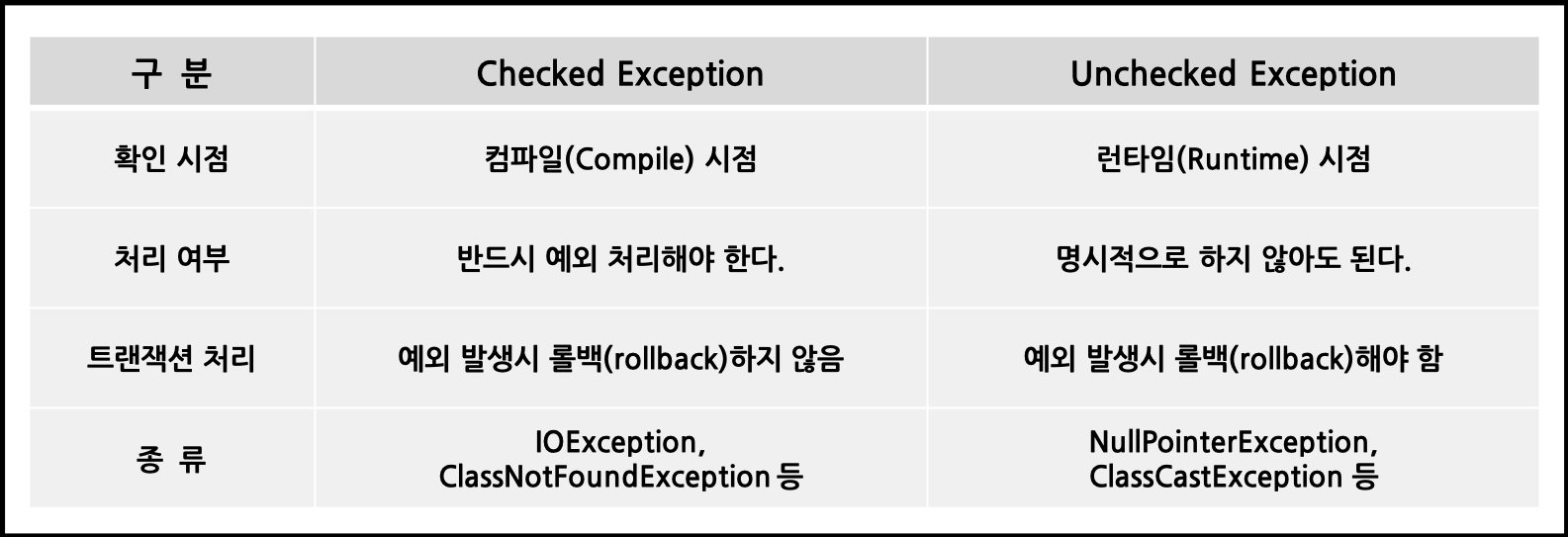 두 번째는 CheckedException과 UncheckedException입니다. 먼저 둘의 특징을 알아보겠습니다.