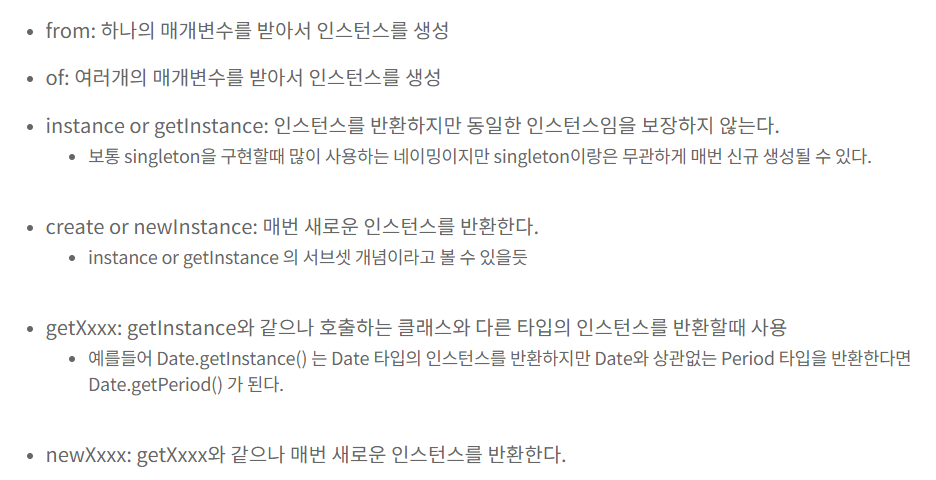 다음으로, 정적 팩토리 메소드 네이밍 컨벤션을 지키라는 것입니다.