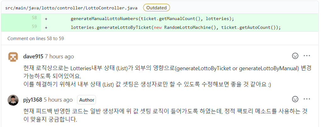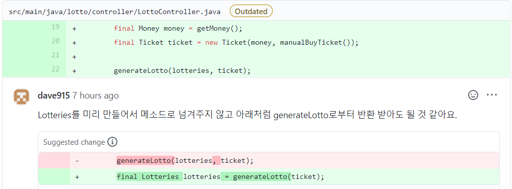 마지막으로는 사용자가 입력한 로또 번호를 한 번에 받고, LottoController에서 Lotto를 생성하는 것이 아니라 Lotteries 내부에서 Lotto를 생성하도록 바꾸라는 것입니다. 저는 처음에 List<List<Integer>> numbers 구조로 코드를 작성하였으나, 'List<List<Integer>>'은 가독성을 해친다는 생각이 들었습니다. 그래서 데이브에게 DM을 보내보니까, 'List<String>'으로 작성한 다음에 데이터 타입을 가공하라는 조언을 받았습니다.