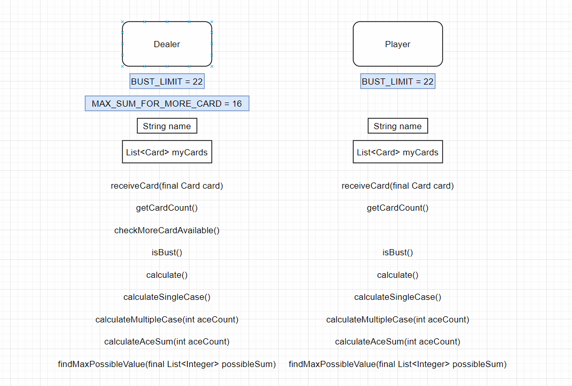 여기서, Dealer는 Player에게 상속받고 MAX_SUM_FOR_MORE_CARD 상수나 checkMoreCardAvailable() 메소드만 따로 정의해 주기로 하였습니다.