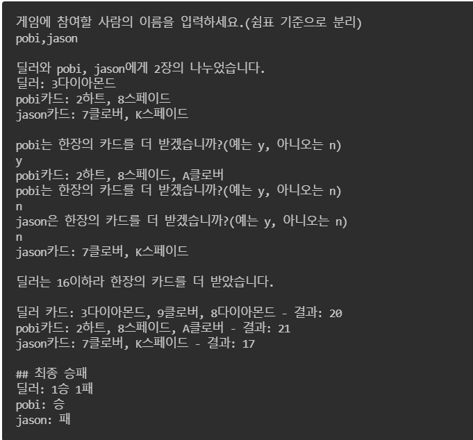 하지만, 바로 밑에 출력문에서 막혔습니다. 딜러 외에 나머지 플레이어는 'xx카드: '인 반면에, 딜러만 '딜러: '였기 때문이죠. 또한, 딜러는 플레이어와 달리 원하는 대로 카드를 뽑을 수도 없어서 부득이하게 딜러 객체를 따로 생성하기로 결정하였습니다.