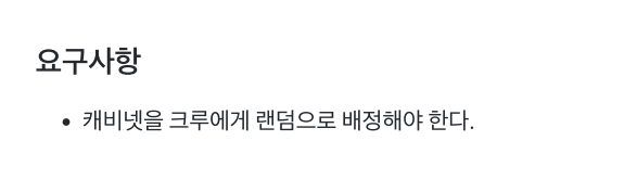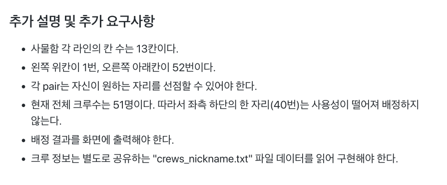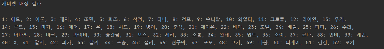 이번주 화요일 처음으로 백엔드 크루들이 루터 회관으로 갔을 때, 간단 미션으로 캐비넷 배정하기를 진행하였습니다. 그런데, 저 혼자 온라인이어서 어리바리를 까다가 미션을 거의 건드리지도 못하고 블랙잭 미션으로 넘어갔습니다. 그 부분이 아쉬워서 오늘은 혼자 크루들의 캐비넷 위치를 배정하는 프로그램을 만들어 보았습니다.