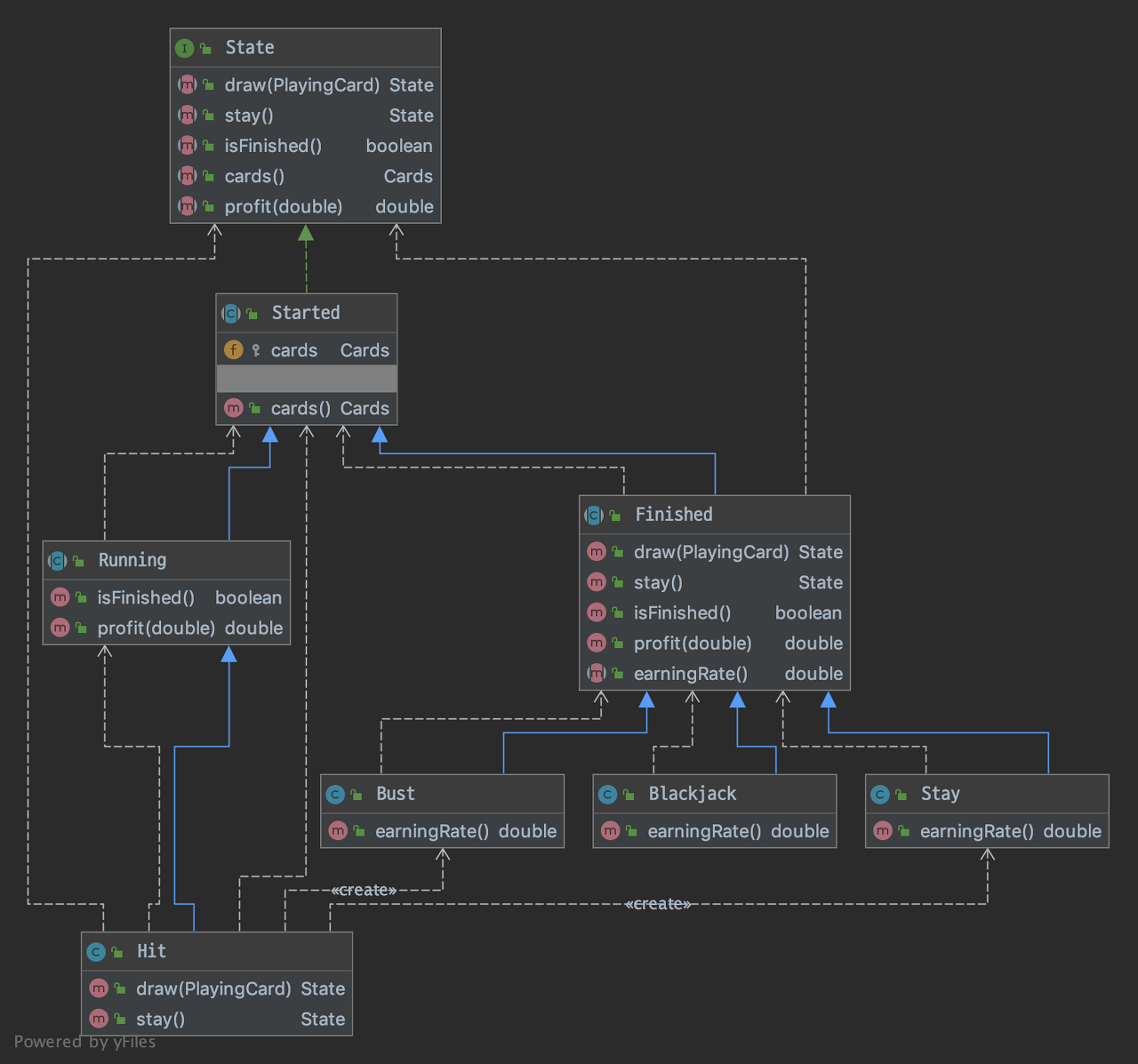 오늘은 오전에 제이슨이 블랙잭 피드백 수업을 해 주셨습니다. 요약하자면, 상태 패턴을 통해 기존의 있던 중복된 코드를 추상화하여 더 나은 구조로 바꾸는 것입니다. 블랙잭 게임에는 상태가 HIT, STAY, BUST, BLACKJACK으로 존재하는데, 이들을 각각 추상화하여 각자의 역할을 수행하도록 만드는 것이 목적입니다. 결과적으로, 아래와 같은 구조를 보입니다.