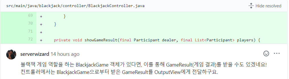 두 번째 수정 사항은 블랙잭 게임 역할을 하는 BlackjackGame을 만드는 것입니다. 기존의 제 코드는 GameResult에서 뷰에 넘겨줄 결과값을 만든 다음에 뷰로 넘겨주었습니다.