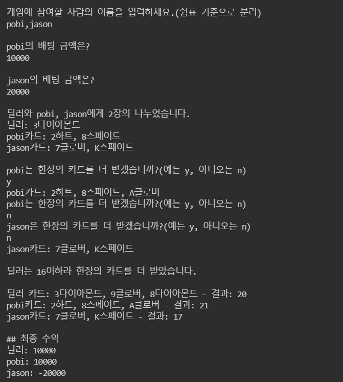 - 나의 카드 합이 딜러의 카드 합보다 크면 승리하고, 작으면 패배한다.