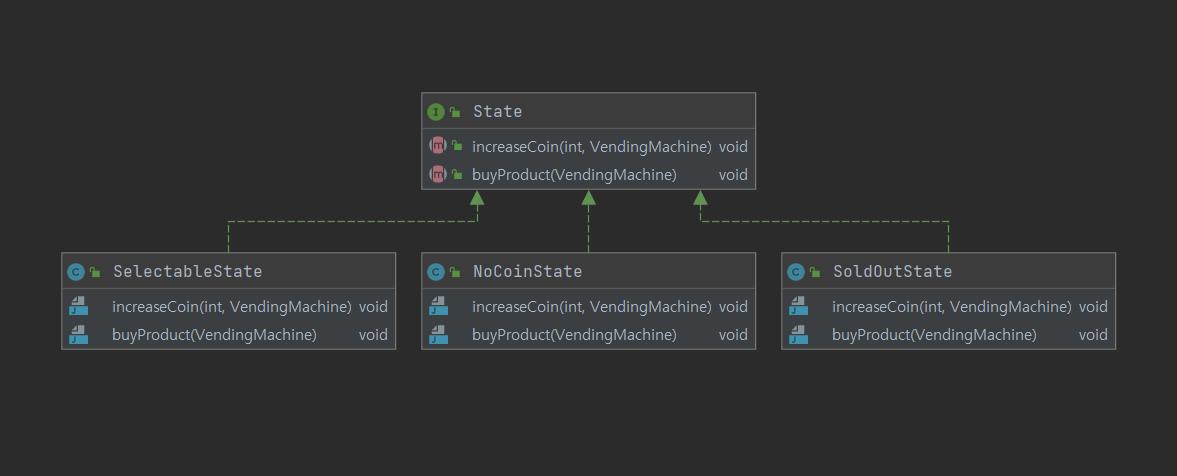 기존에 enum 클래스에 정의해 두었던 상수 각각을 단일 클래스로 만든 다음, 그것의 상위 인터페이스인 State를 정의합니다. 그리고 Context인 VendingMachine 클래스는 이 State를 직접적으로 이용하게 됩니다.