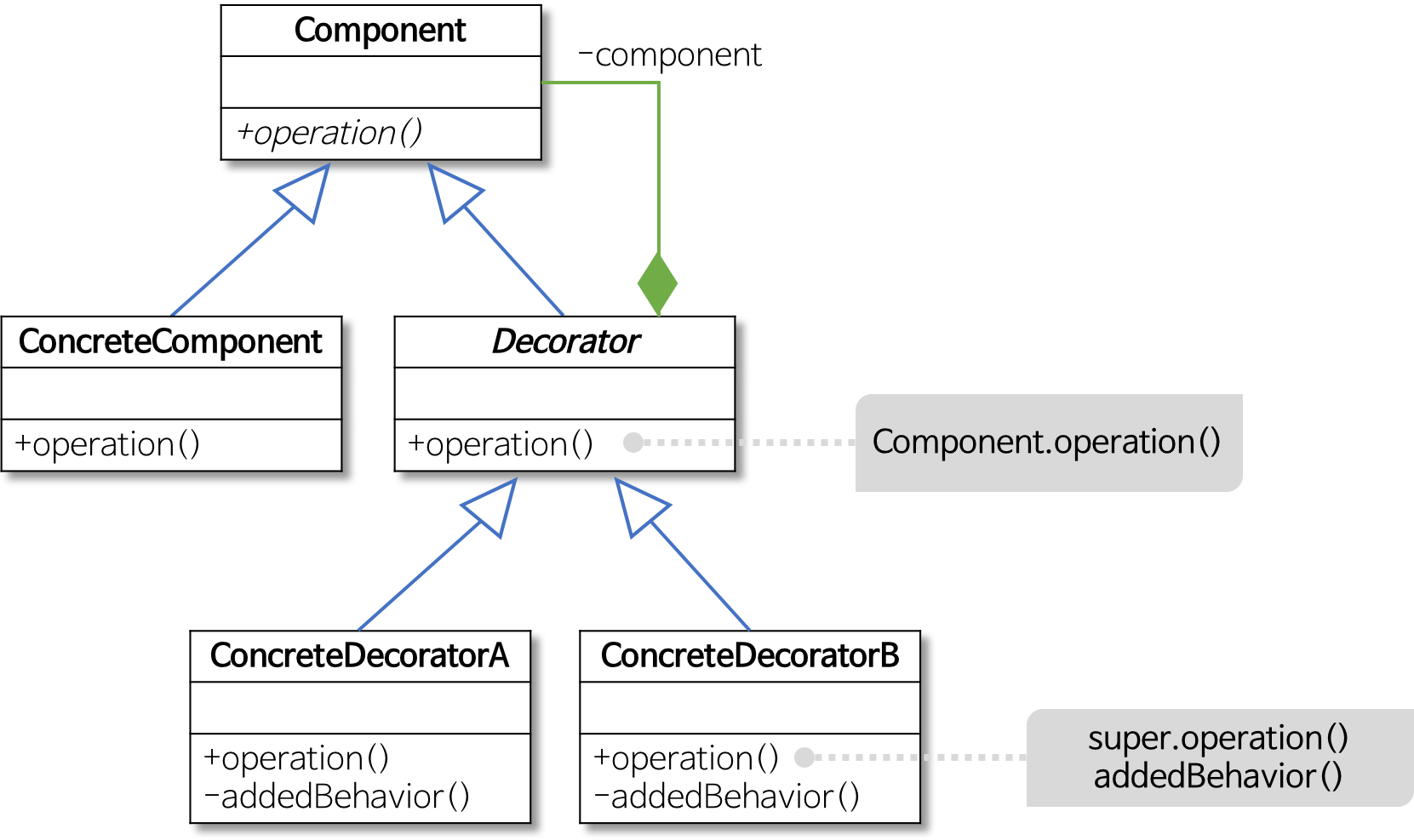 ConcreateDecorator은 Decorator의 하위 클래스로, Component의 기본 기능과 Decorator의 추가 기능을 모두 제공합니다. 그래서 ConcreateDecorator는 ConcreteComponent에 대한 참조가 필요한데, 조합을 통해서 표현합니다. 이 부분은 예제를 통해 보시는 것이 이해하기 쉽습니다.