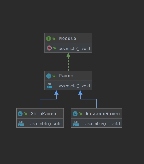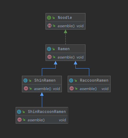Noodle을 상속받아서 assemble() 메소드를 오버라이드해 주는 것은 당연합니다. 여기서 주목할 점은 기본 기능인 Ramen를 참조하기 위하여 조합을 사용하였다는 점입니다. 필드에 Noodle 변수를 정의하고, 생성자를 통해 값을 넘겨받으면 됩니다.