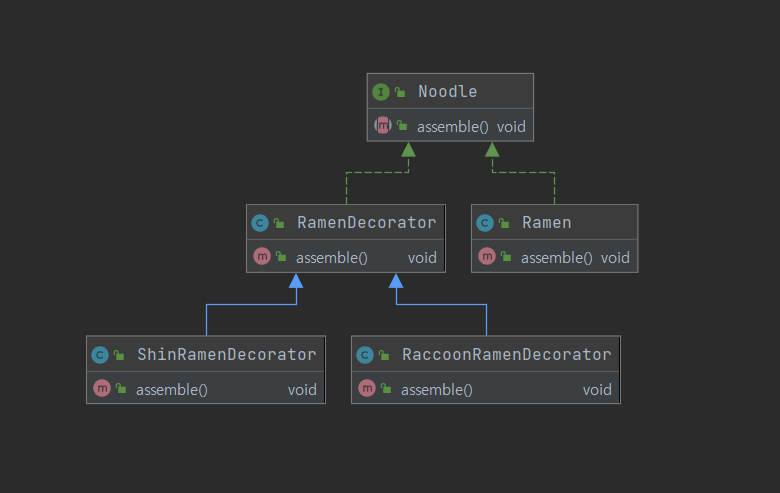 위가 바로 데코레이터 패턴을 적용한 구조입니다. 관건은 RamenDecorator인데, 코드를 먼저 보겠습니다.